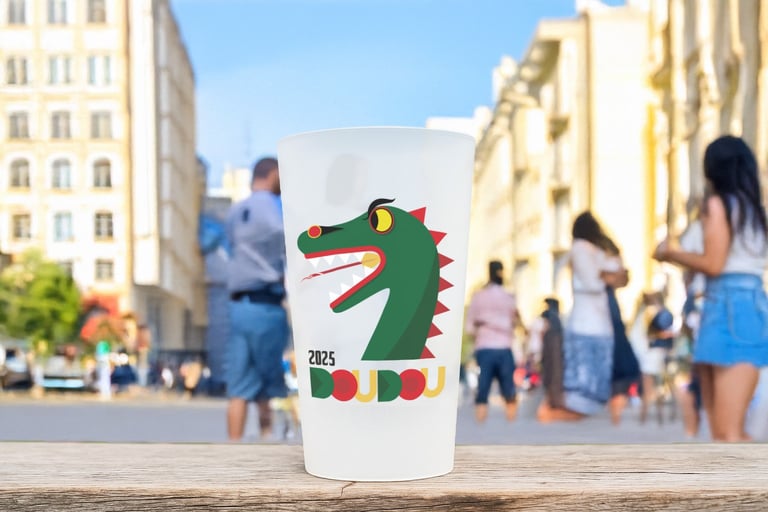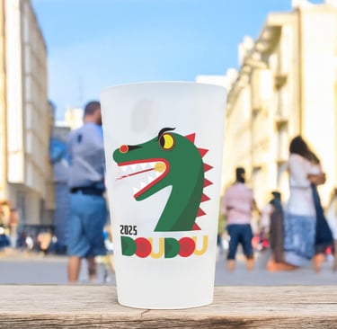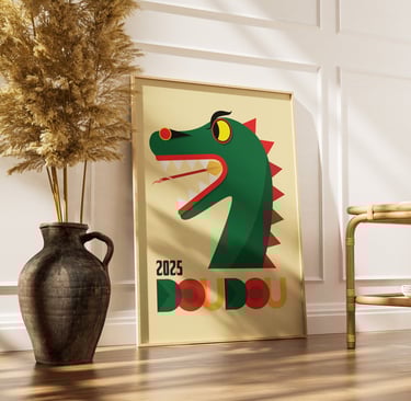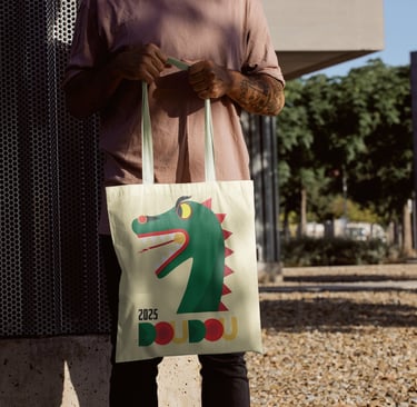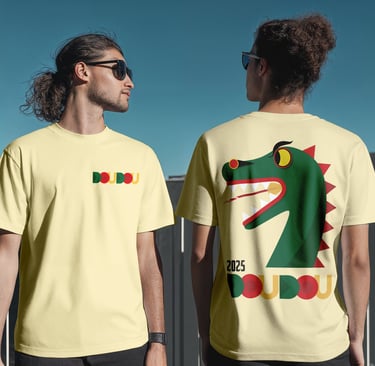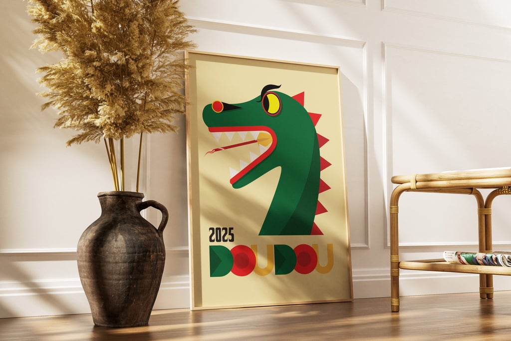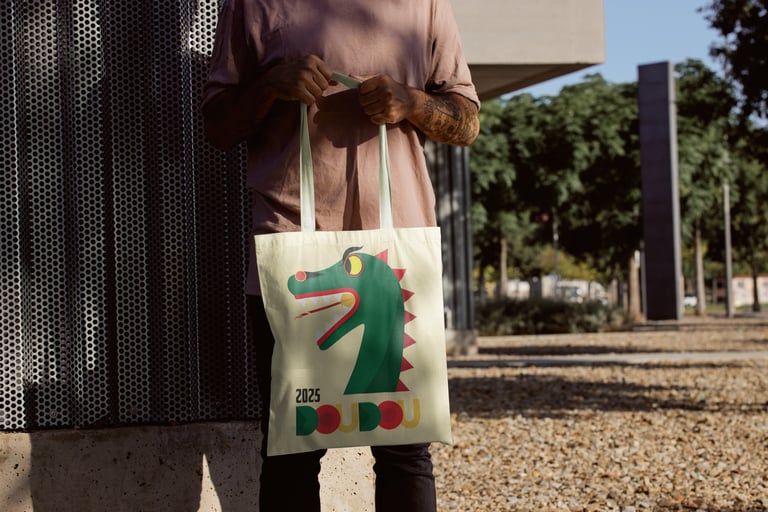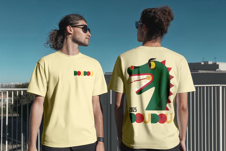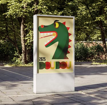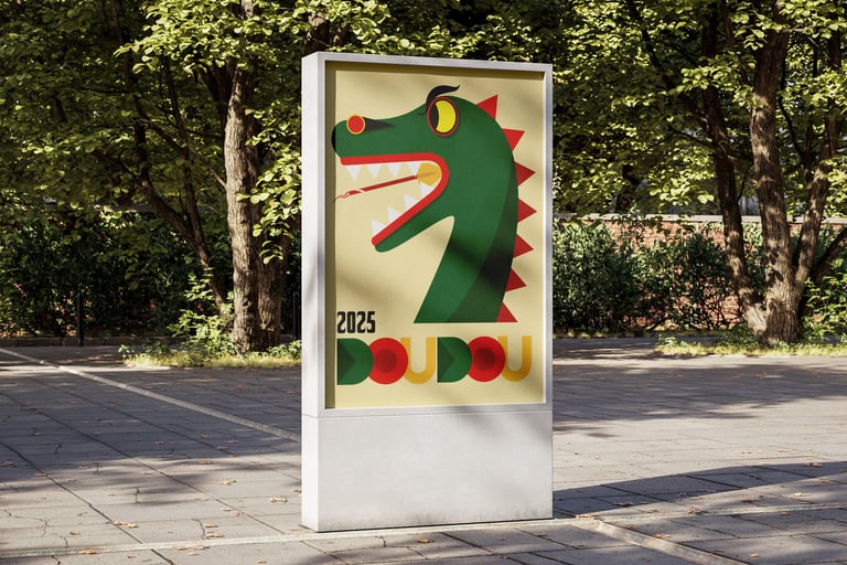 Affiche réalisée en dessin vectoriel, avec un jeu d’aplats colorés pour illustrer l’énergie du Doudou de Mons, édition 2025.